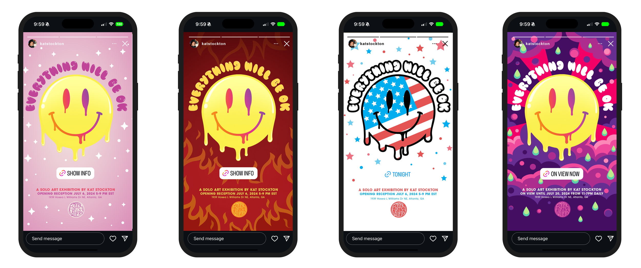 In July 2024, I produced my first solo exhibition, “Everything Will Be OK” and displayed it at Empire Arts Gallery in Atlanta, GA. I created a new body of work consisting of 63 individual paintings, merchandise and packaging, promotional postcards, posters, and social media content.